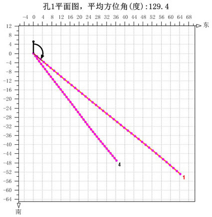 某集團(tuán)某礦鉆場(chǎng)雙探水孔在水平面(XY面)投影(單獨(dú)反映鉆孔的方位角)