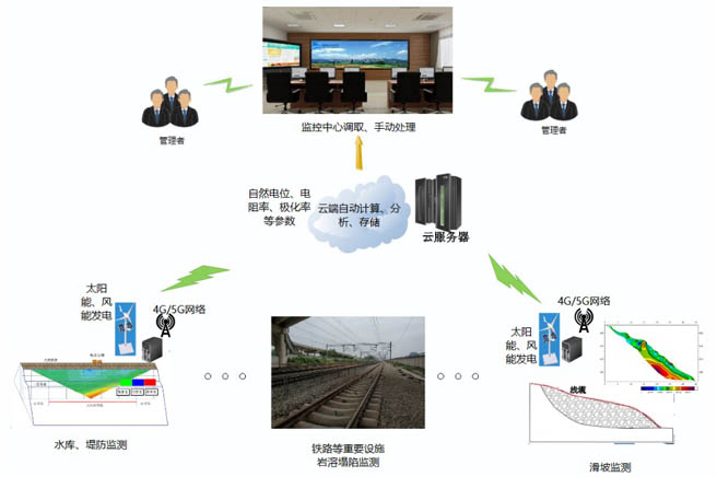 監(jiān)測(cè)系統(tǒng)硬件采用模塊集成的數(shù)據(jù)采集機(jī)箱及傳感器線纜組成�,F(xiàn)場(chǎng)安裝方便,只需將線纜埋入工程巖土體表面或內(nèi)部并連接采集機(jī)箱,數(shù)據(jù)采用4G/5G模塊或者光纖進(jìn)行傳輸。系統(tǒng)根據(jù)軟件設(shè)定的參數(shù)進(jìn)行數(shù)據(jù)采集,采集的電性參數(shù)豐富,數(shù)據(jù)自動(dòng)上傳云端進(jìn)行自動(dòng)化處理,并對(duì)處理結(jié)果進(jìn)行計(jì)算比對(duì)成圖,在數(shù)據(jù)異常時(shí)及時(shí)報(bào)警。