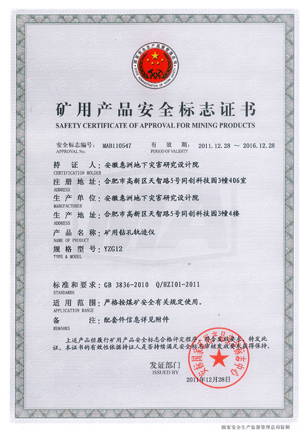 在院長室的堅強領導下,在各部門的大力配合支持下,經研發(fā)中心硬件部全體員工的不懈努力,精心設計研制的YZG12型礦用鉆孔軌跡儀,嚴格按安標國家礦用產品安全標志中心的煤安資格要求,制訂了健全的質量管理體系;技術文件與安標國家中心審查確認的一致,作業(yè)指導文件齊全;生產設備、檢驗儀器設備完善;檢驗人員對儀器、設備操作較為熟練,標準掌握程度為熟悉;整體生產條件和質量管理體系符合相關評審準則的要求,具備生產能力;己于2011年12月28日獲得安標國家礦用產品安全標志中心標志證書。