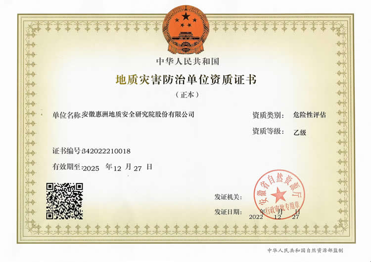地質(zhì)災害防治危險性評估乙級資質(zhì)證書