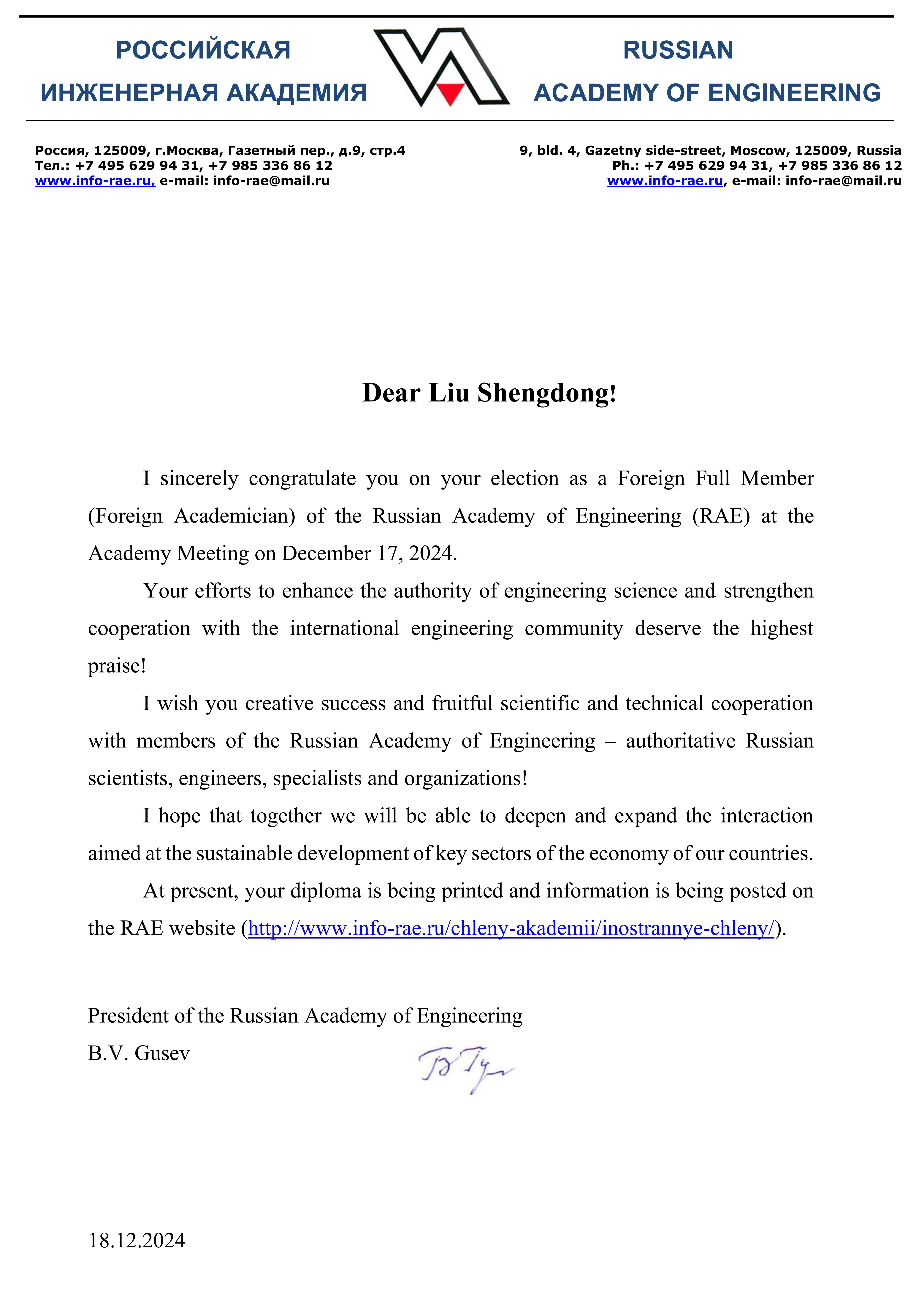 經(jīng)俄羅斯工程院院士推薦,通過(guò)形式審查、材料審核、專家委員會(huì)的審核等流程,劉盛東教授在2024年12月17日舉行的俄羅斯工程院(RAE)院士大會(huì)上當(dāng)選為俄羅斯工程院外籍院士。12月18日,俄羅斯工程院(Russian Academy of Engineering,RAE)B.V.Gusev院長(zhǎng)向劉盛東教授發(fā)來(lái)賀信,祝賀他當(dāng)選成為俄羅斯工程院外籍院士,希望未來(lái)他為中俄兩國(guó)的可持續(xù)發(fā)展開(kāi)展創(chuàng)造性和富有成效的科學(xué)技術(shù)合作。