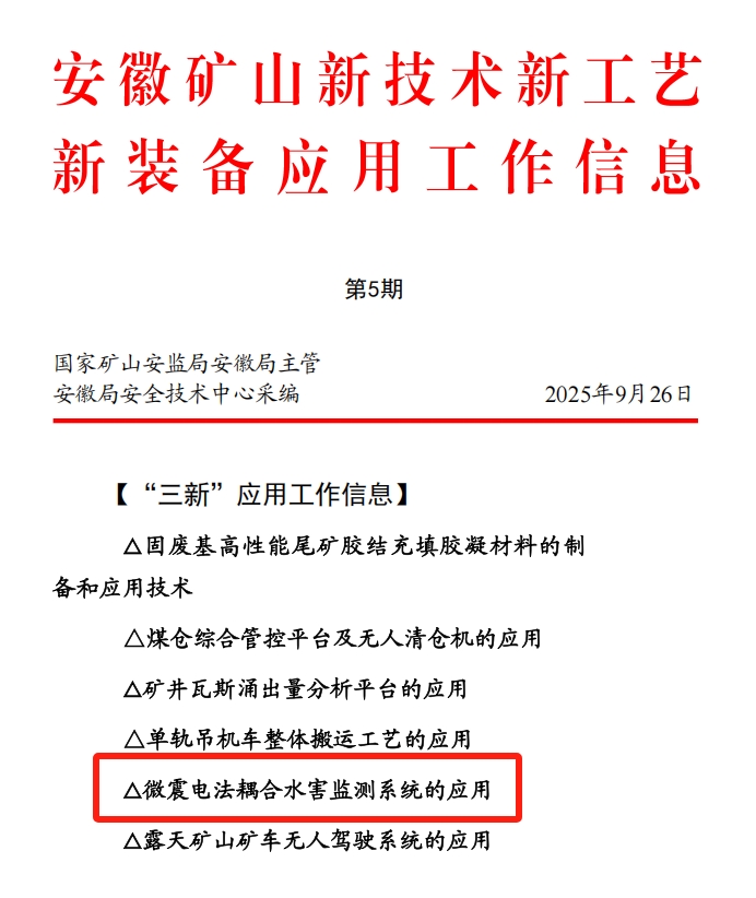 近日,惠洲院研發(fā)的“微震電法耦合水害監(jiān)測預(yù)警系統(tǒng)”憑借其創(chuàng)新的技術(shù)理念、顯著的防治成效與廣闊的應(yīng)用前景,成功入選國家礦山安全監(jiān)察局新技術(shù)推廣目錄。